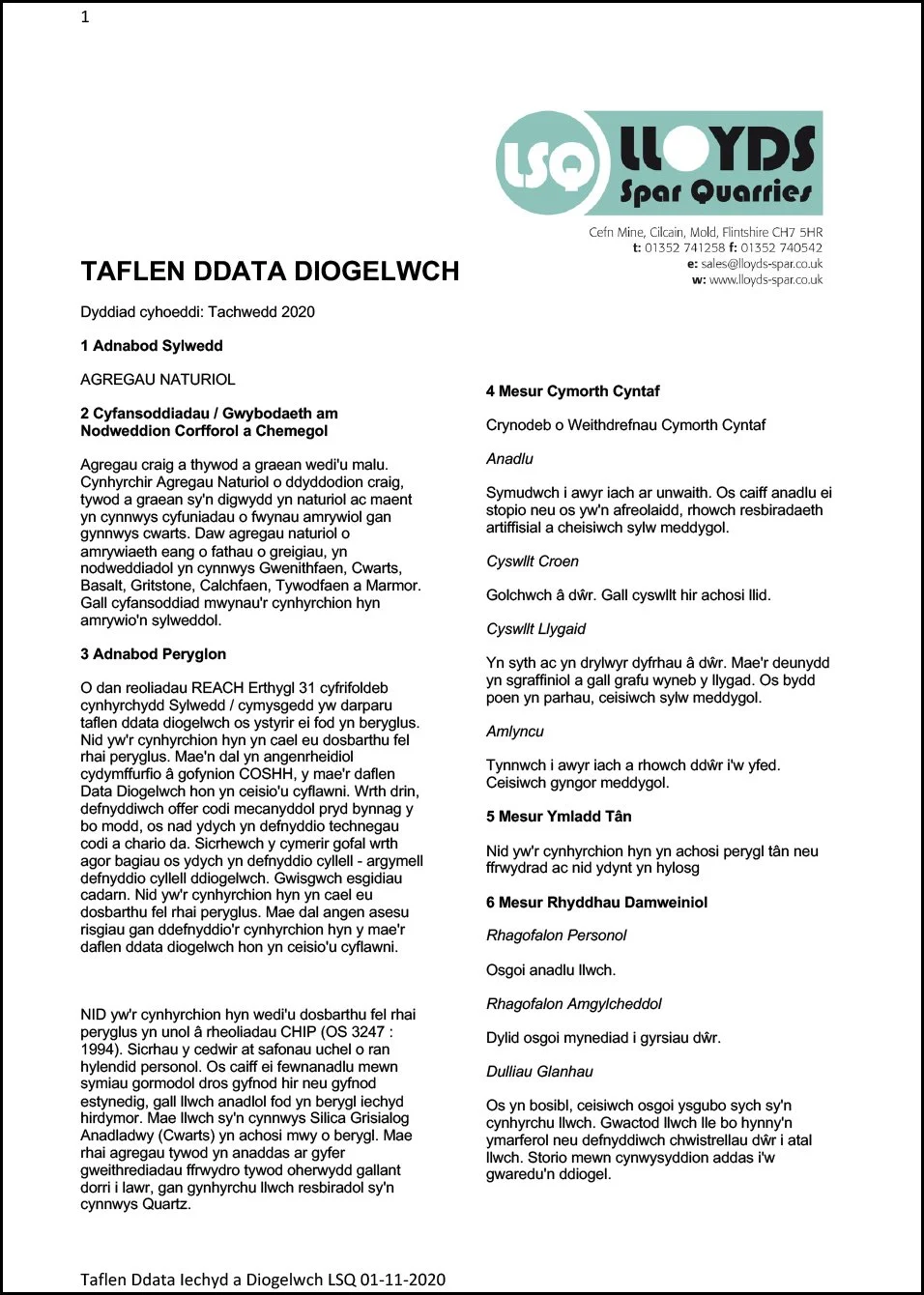 Taflenni Data Cynnyrch Cliciwch ar unrhyw ddogfen i'w lawrlwytho Agregau DryDash. Taflen Data Deunydd Agregau Addurnol. Taflen Data Deunydd Agregau Naturiol Taflen Data Diogelwch